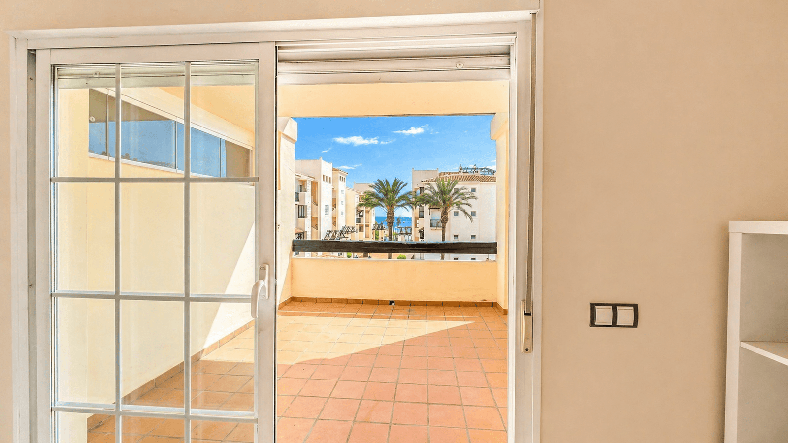 From the balcony, the outlook extends across Phase 1 of Residencial Duquesa, with partial sea views visible between the neighbouring buildings. As a result, the property offers a pleasant outdoor setting without losing the convenience of a central, walkable location.