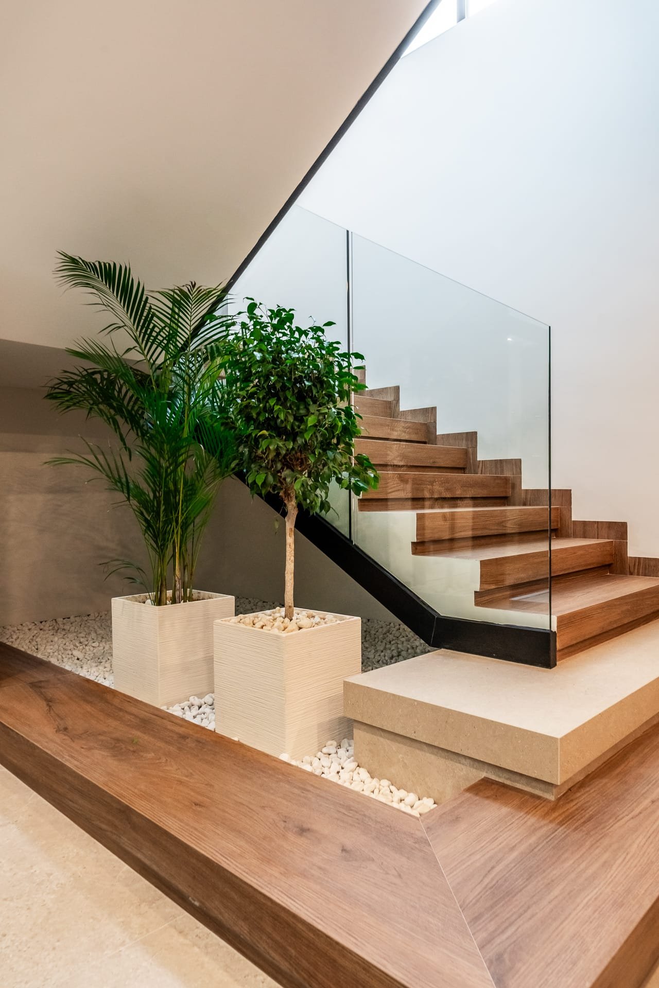 The architectural concept centres around two glass volumes, forming a striking internal courtyard where a mature olive tree creates a calm focal point. This design enhances both flow and natural connection throughout the home.