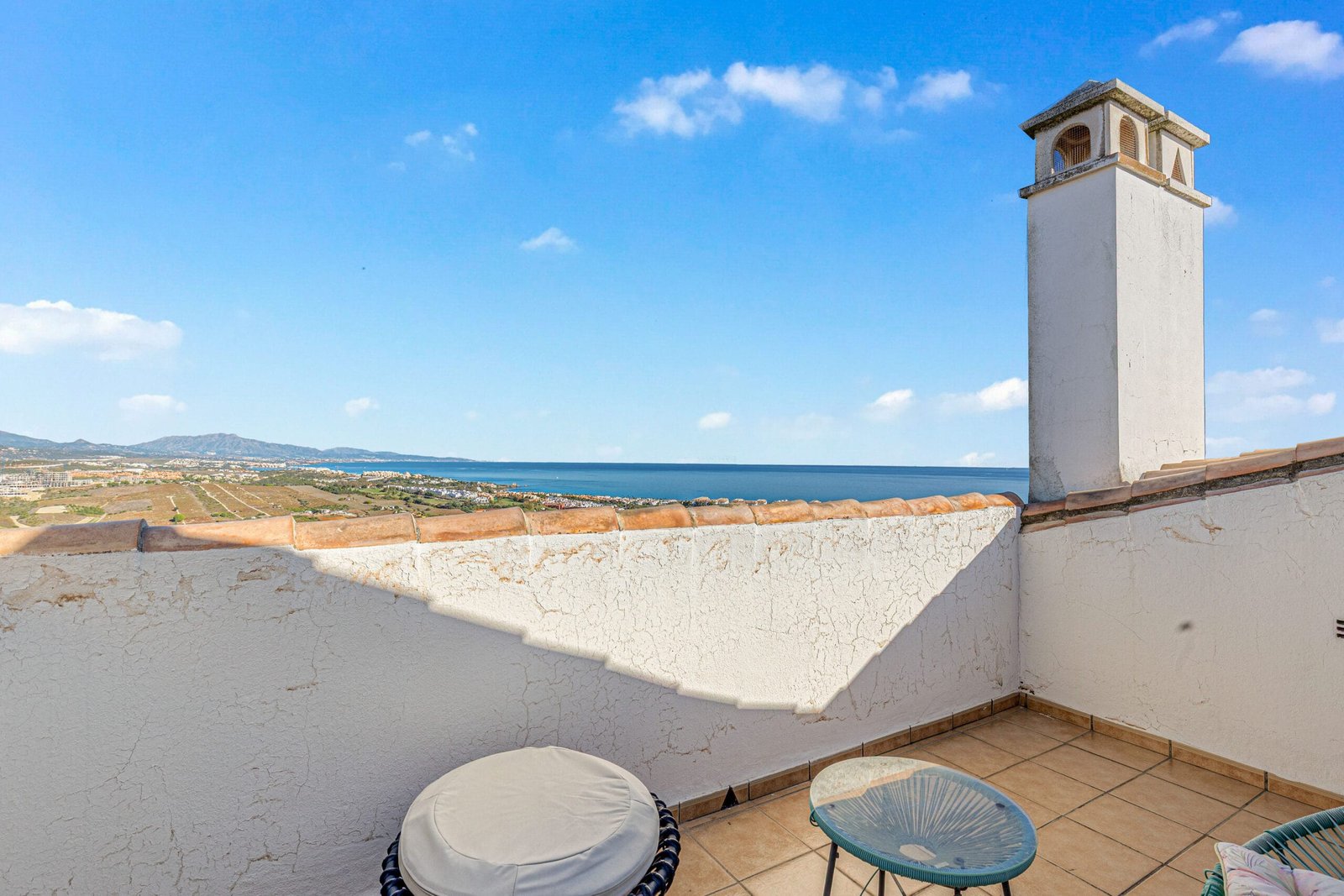 Off the main lounge, a large semi-covered balcony acts as an outdoor room in its own right, with views over vineyards, the communal pool, mountains and the coastline sweeping towards Estepona.
