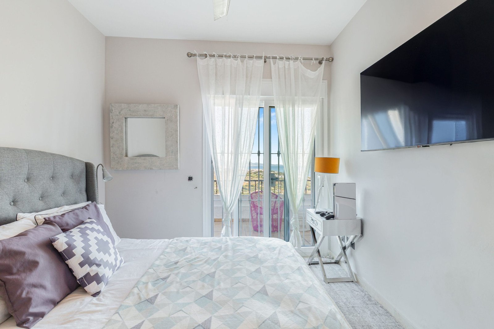 The lounge is bright and inviting, framed by views that steal your attention the moment you enter. Slide open the doors to a large semi-covered balcony and the landscape unfurls: vineyards and the communal pool in the foreground, mountains rising behind, and a coastline that sweeps towards Estepona. It’s a true outdoor room – somewhere to start the day with coffee and end it with sunset dinners – sheltered enough for year-round use yet open to the vistas that define the property.